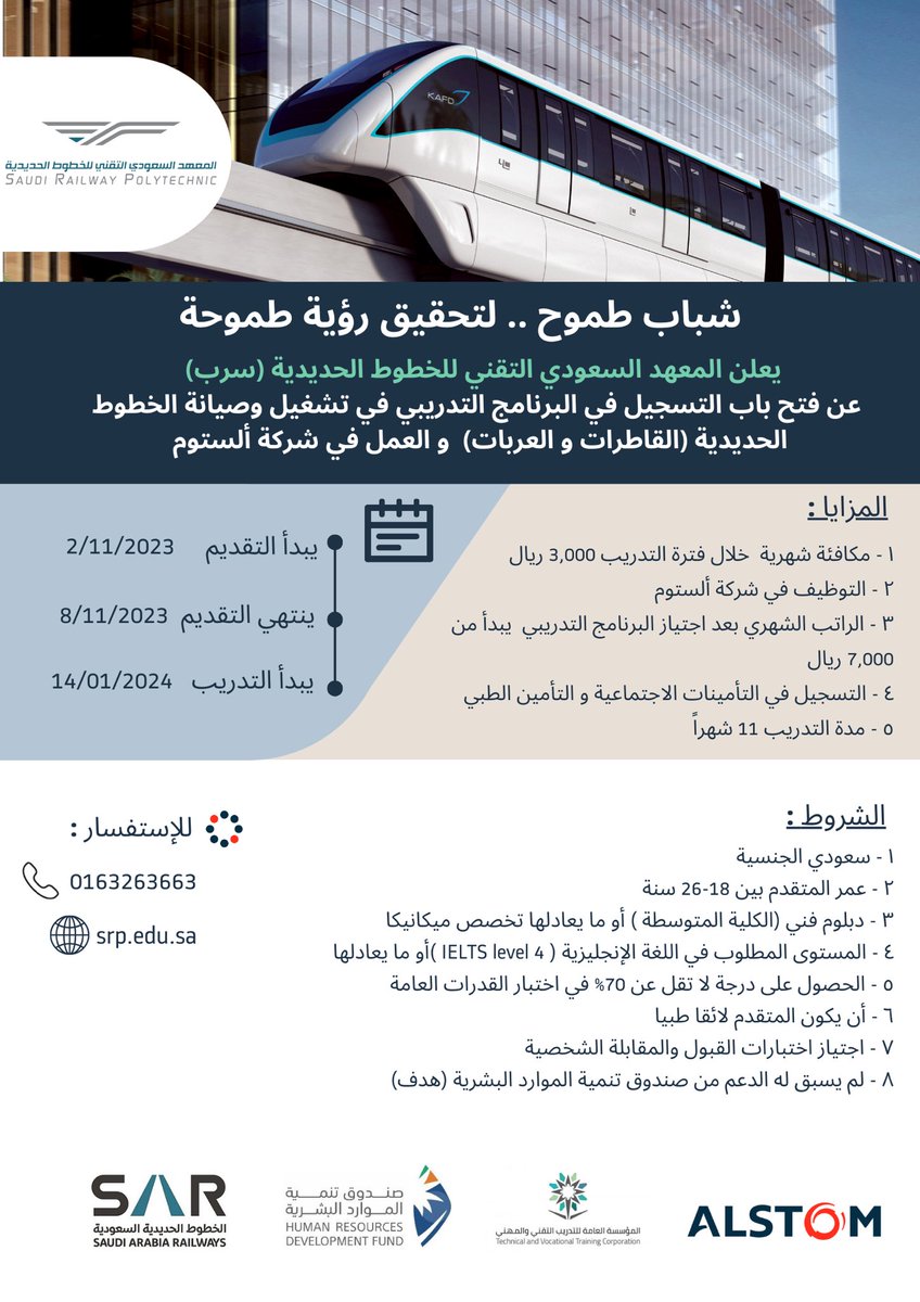 يعلن المعهد السعودي التقني للخطوط الحديدية (سرب) عن فتح باب التسجيل في البرنامج التدريبي في تشغيل وصيانة الخطوط الحديدية (القاطرات و العربات) والعمل في شركة ألستوم، وذلك وفقاً للتفاصيل التالية: